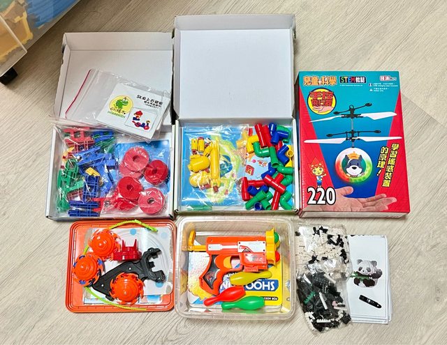 玩具多約七到八成新,科學玩具、熊貓積木全新。