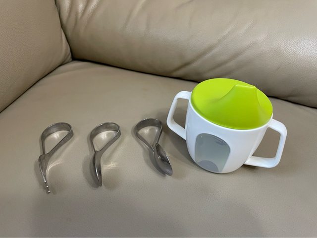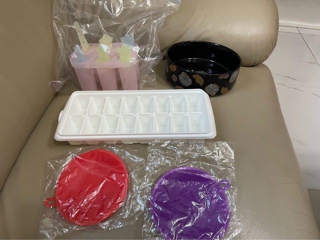 乳牛存錢筒、製冰盒,隔熱套、兒童水杯及湯匙叉子(未用)等物品,希望一次帶走