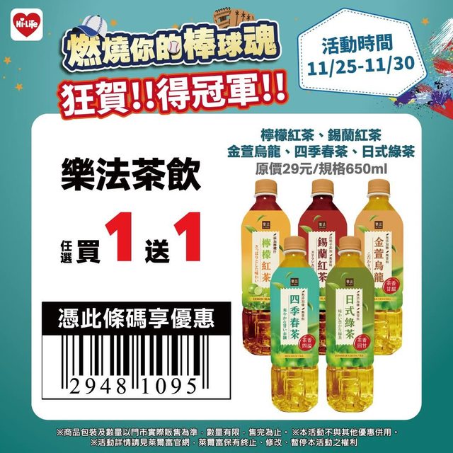 9、11/25-11/30 萊爾富各種飲料買一送一