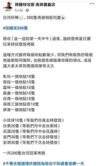 將在「這一週的某一天中午過後」,臨時發佈當日攤位某時段發放烤雞