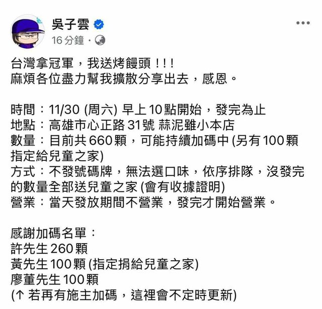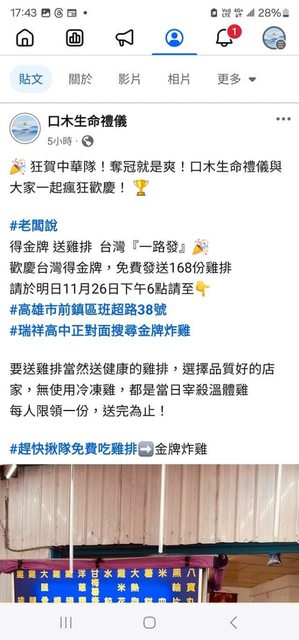 11/26 下午6點 口木生命禮儀發168份雞排 祝福台灣一路發!
