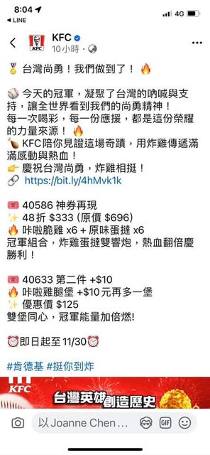 3、即日起至11/30 肯德基優惠碼