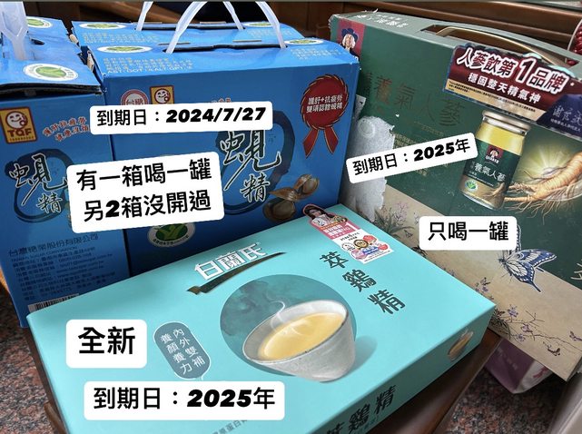 物品名稱:台糖蜆精(已過期)、桂格養氣人參7罐、白蘭氏萃雞精7包