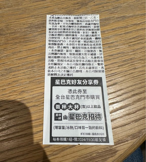 物品名稱:星巴克買一送一券,今天到期