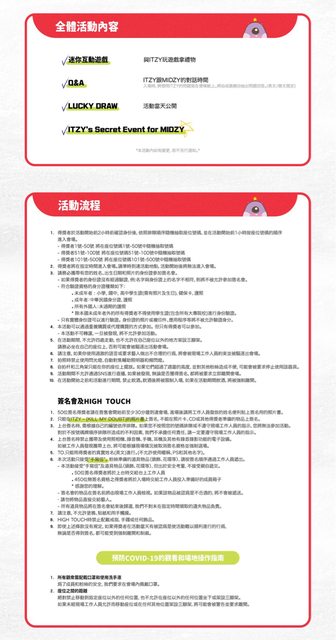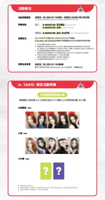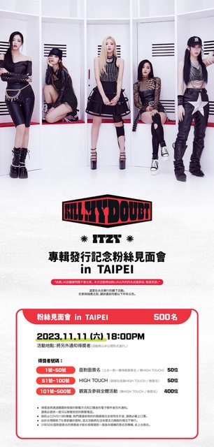 ITZY專輯發行記念粉絲見面會in TAIPEI 成員LIA因健康問題不會出席 本次活動將由除LIA以外的四名成員參與 敬請見諒 - 粉絲見面會 in TAIPEI 500名 2023.11.11(六)18:00PM 活動地點:將另外通知得獎者 (活動將以非公開形式進行。) 1號~50號 50位 面對面簽名 (上台一對一獲得親筆簽名 /無HIGH TOUCH) 51號~100號 50位 HIGH TOUCH (與每位成員HIGH TOUCH /無簽名) 101號~500號 400位 觀賞及參與全體活動 (無HIGH TOUCH/ 無簽名) ▍全體活動內容 -迷你互動遊戲 與ITZY玩遊戲拿禮物 -ITZY跟MIDZY的對話時間 入場時,將想問ITZY的問題寫在便條紙上 將由成員親自抽出 -Q&A -LUCKY DRAW活動當天公開 -ITZY's Secret Event for MIDZY 主辦單位/ K-MONSTAR https://www.kmonstar.com.tw/products/231111-itzy-killmydoubt-taipei https://i.imgur.com/3zJjE9S.jpg