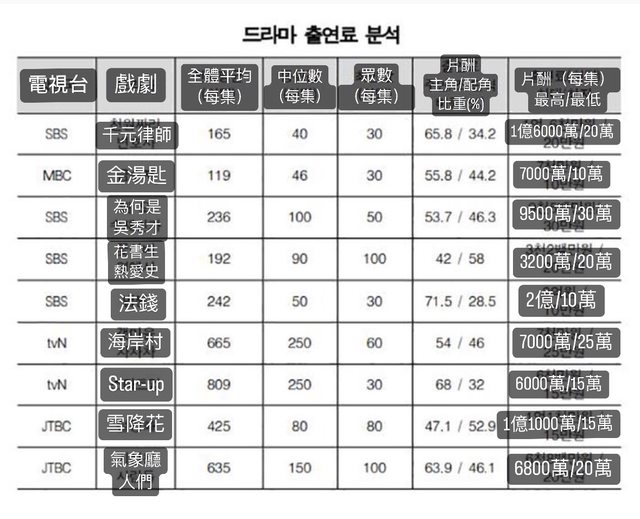 戲劇主角2億, 配角10萬..出演費最多差2千倍 媒體名稱:SBS 新聞連結:https://n.news.naver.com/mnews/article/055/0001099901?sid=103 記者姓名:柳永奎(音譯) (若有則必須貼出) 新聞全文: 據今天(24日)國會文化體育觀光委員會委員長、共同民主黨議員李相憲,從韓國放送演員工 會和韓國放送出演者權利協會收到的《演員工資制度實態調查及改善方案研究》報告書顯示 ,在過去2年間播出的9部電視劇中,主演和配角演出片酬差距最大的電視劇是SBS《法錢/權 貴復仇》。 該劇主演李善均每集片酬2億,配角演員每集收入10萬元。 SBS《千元律師》的演員南宮珉每集片酬1億6000萬元,配角演員最低每集20萬元,相差800 倍。 JTBC《雪降花》主演是1億1000萬元,配角15萬,相差733倍;MBC《金湯匙》主角7000萬元 ,配角10萬,相差700倍。 電視劇製作現場通用的最低片酬每集20萬~30萬是最常見的。 拍攝一集的份量平均需要花費2.63天,一天拍攝中演員們包含待機時間3.88小時,平均勞動 時間為9.99小時。 據調查,由於出演費用合約沒有規定勞動時間或條件,有只支付每集出演費的慣例,所以出 演費用滴的的配角演員,撇除服裝費等經費外,實際收入甚至達不到最低工資。 外國以實際拍攝所需的時間為基準制定出演費用,而韓國則根據集數制定出演費用,因此不 能完全反映勞動力和時間,這也是問題所在。 李相憲議員強調:「應該設定出演費用下限,向給演員們賦予最低限度的標準和補償的方向 謀求平均化,為了保護因惡劣的出演費而受到生計威脅的配角演員們的勞動權和生存權,應 該進行制度上的討論。」 https://i.imgur.com/g2s65AR.jpg