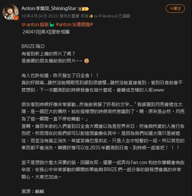 是今年4月看到日全食後在Weverse上傳的文章