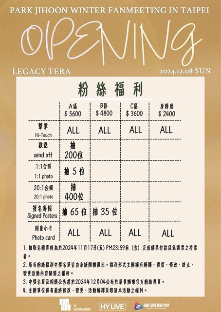 粉絲福利:於2024/11/17 PM23:59前(含)購買票券並完成訂單者,將有機會獲得下列粉絲