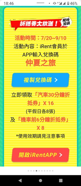 活動時間:7/20~9/10 活動內容:iRent會員於APP輸入兌換碼 仲夏之旅 立即領取「汽車30分鐘折抵券」X 16 (平假日各8張) 及「機車前6分鐘折抵券」X 8 https://i.imgur.com/kiTZhLf.jpg