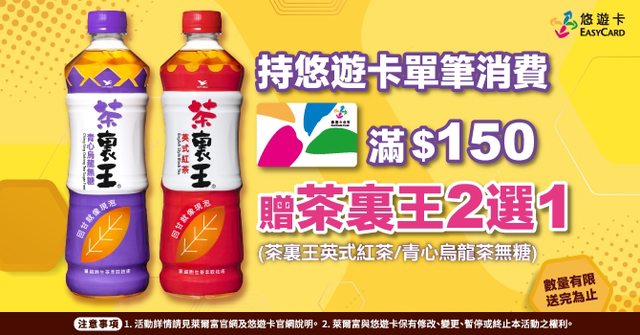 萊爾富嗶悠遊,單筆滿150元送茶裏王(兌換券)