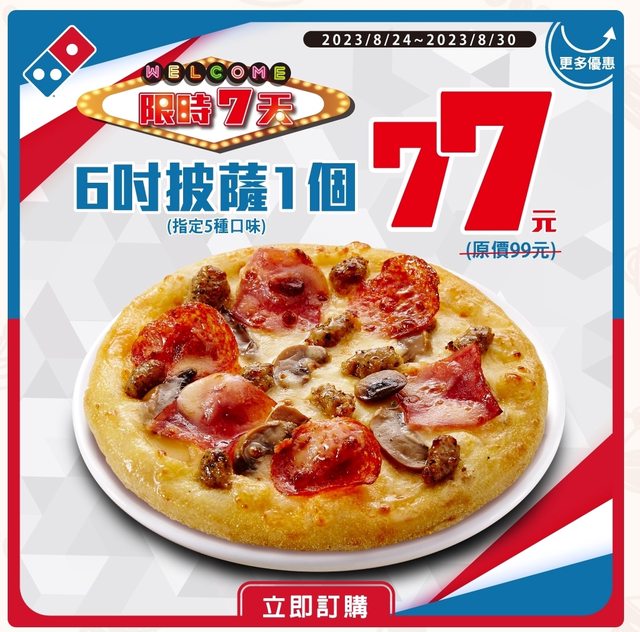 【Lucky 777】6吋披薩77元 促銷代碼:OLK77 限時7天:8/24-8/30 口味限定:總匯、夏威夷、道地美國、皇家白醬彩蔬、增量起司餅 http://i.imgur.com/Tq8zdof.jpg