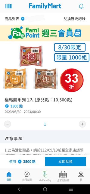 全家週三會員日 這次是我最喜歡的極鬆餅系列可以兌換欸! 蜂蜜跟巧克力口味都不錯吃~~ 喜歡的可以參考 8/30限定(限量1000組) 兌換方式:3500點免費換1個極鬆餅 (原兌點要10500點) https://i.imgur.com/QoF4J07.jpg
