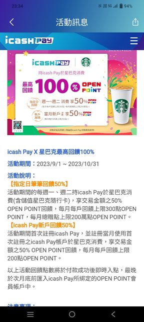 如題 限週一以及在週二兩天 儲值也算,嘻嘻,上限300點openpoint 新用戶回饋100趴 詳見圖 https://i.imgur.com/OgcptL0.jpg