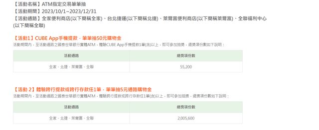 → Kazamatsuri: 這活動是自家ATM 不會有跨提手續費 36.226.67.55 10/07 13:18