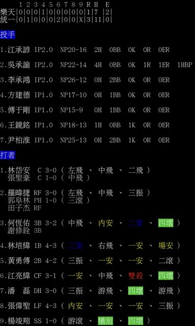 羅暐捷 RF 3-0 ( 左飛 、 中飛 、 三振 )