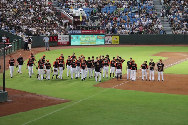從休息區出來和外野球迷揮手的球員們
