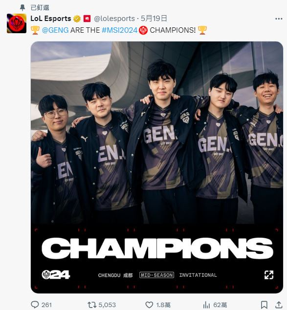 → ap9xxx : 世界線是BLG拿今年MSI冠 那中服的慶祝絕對不會跟韓 05/25 14:27