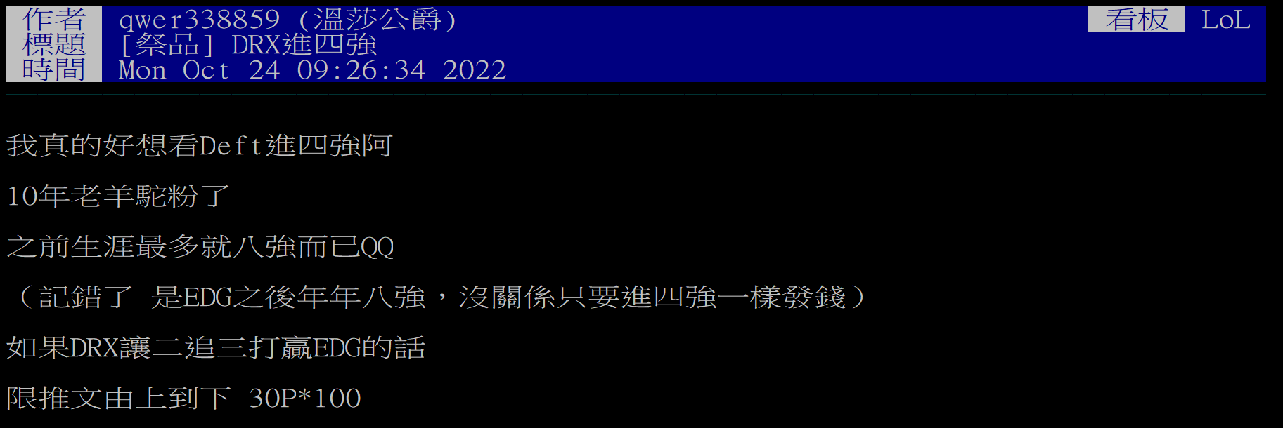 → a125g : 邱味接下來一年一冠 27歲就能趕上faker的成就 08/03 16:45