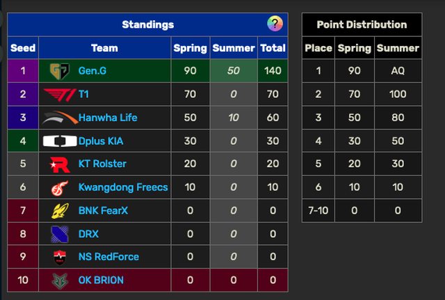 隊伍名次 大分 小分 連勝 本週對手 下週對手 1 GEN 14- 0 +27 14W DRX KT NS HLE 2 HLE 11- 3 +15 1W BRO DRX FOX GEN 3 DK 9- 5 +7 1W FOX NS BRO KT 4 T1 8- 6 +3 1L NS BRO KDF FOX 5 KT 7- 7 -1 1L KDF GEN DRX DK 6 FOX 7- 7 -3 1W DK KDF HLE T1 7 KDF 6- 8 -1 1W KT FOX T1 DRX 8 DRX 3-11 -15 1L GEN HLE KT KDF 9 NS 3-11 -15 4L T1 DK GEN BRO 10 BRO 2-12 -17 1W HLE T1 DK NS 藍色:確定季後賽第二輪(=獲得天使甲) 綠色:確定季後賽 灰色:確定無緣季後賽 * GEN 由於 MSI 冠軍+進入季後賽已確保世界賽名額,唯種子序未定。 賽程來看季後賽就是剩下5搶4,看KT、FOX、KDF誰會掉隊 季後賽第一輪是例行賽第三名選第5/6名之一,第四名打剩的,BO5單淘汰 勝出者跟例行賽前二打第二輪雙敗淘汰,例行賽第一選第一場對手,勝出兩隊進決賽 年度積分表如圖 https://i.imgur.com/uXUKlPu.png
