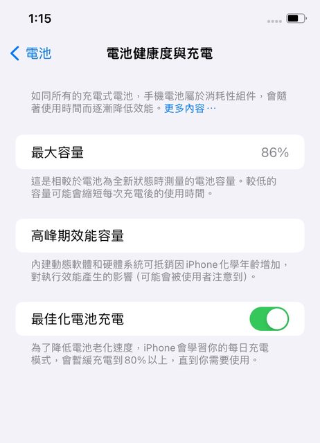 手機今年六月換過電池,目前健康度86%