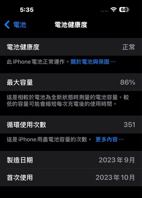 電池健康度86% 循環次數351