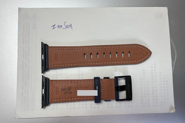 1. Beepio悠遊卡錶帶,正面深藍,背面棕色,悠遊卡在短邊,照片用灰色條擋住卡號