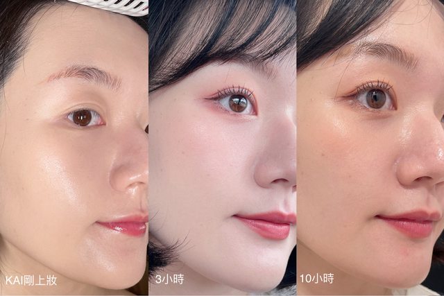 左半臉上kaibeauty,最後的妝容上可以看出左臉頰有微脫妝,法令紋有一點卡粉