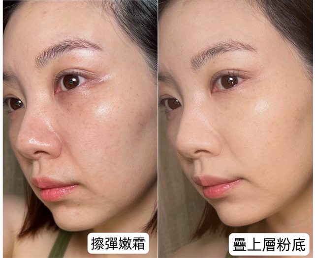 左:擦完彈嫩霜後的毛孔會些微被修飾掉,加上皮膚會有充足保濕滋潤感