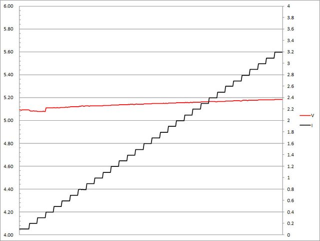 ▼固定檔5V輸出負載測試,隨著電流增加,輸出電壓上升,輸出電流超過3.2A截止