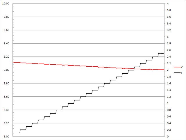 ▼固定檔9V輸出負載測試,隨著電流增加,輸出電壓下降,輸出電流超過2.5A截止