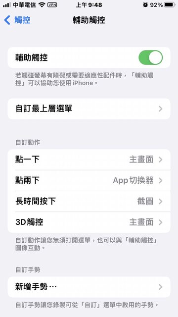 我是設定成這樣,按一下回首頁,按兩下APP切換,長按截圖