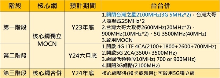 二、服務及網路品質提升部分:台灣大哥大自行承諾提升服務及網路品質、投資軟硬體事項,公平會亦要求須於合併後5年內每年提交行動寬頻網路整合與優化等提升網路性能及服務品質之具體實施成果,以及台灣大哥大符合自行承諾有益於整體經濟利益之成果報告備查。