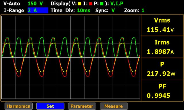▼USB-C1、USB-C2、USB-C3三埠總輸出功率198.87W的輸入交流電壓/電流/功率波形如下