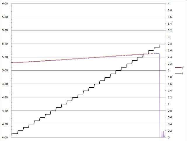 ▼C1(紅)/C2(綠)搭配5A線材的固定檔5V輸出負載測試,隨著電流增加,輸出電壓上升,
