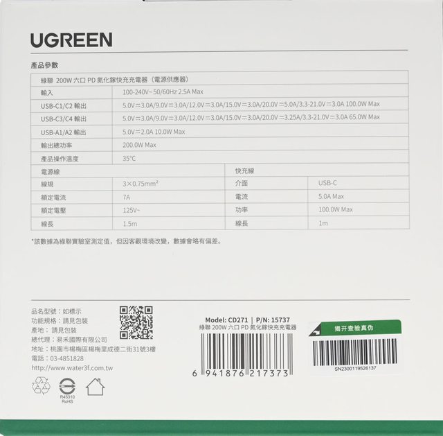 標題[心得] UGREEN綠聯200W六埠GaN快速充電器CD271