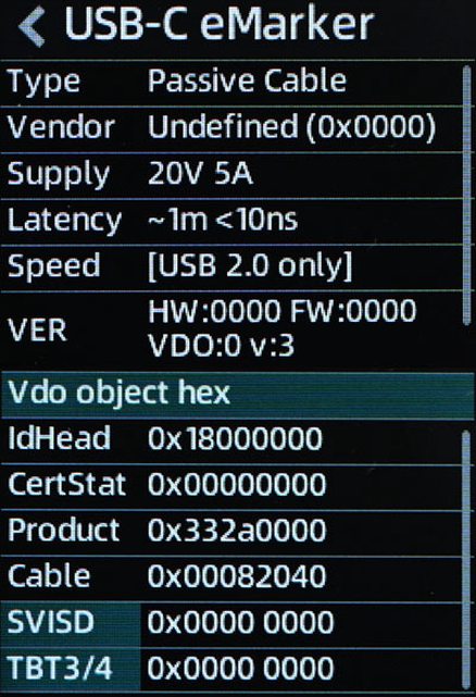 ▼充電線E-Marker資訊,電力傳輸支援20V/5A 100W,資料傳輸支援USB 2.0