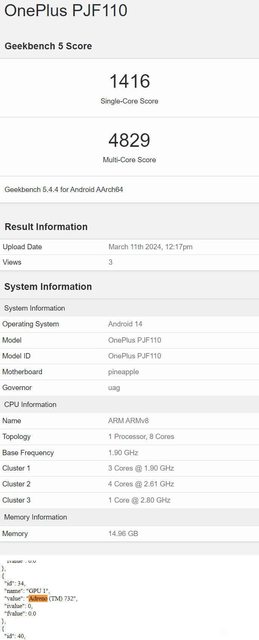 參考 一加12R(CPH2611) 用8G2 的GB5 單核1497 /多核4950