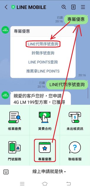 25.會變成進階LM專屬模式,按「專屬優惠」,再按對畫框裡的「LINE代幣序號查詢」。 https://i.imgur.com/719tk9G.jpeg
