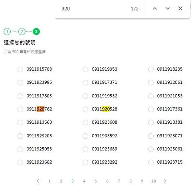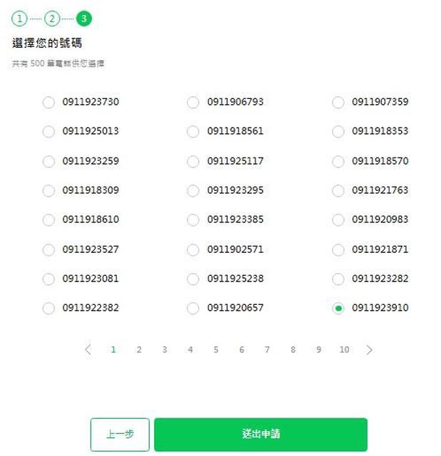 10.請拿出之前登記的門號,接收與輸入手機驗證碼。 11.輸入收到的手機驗證碼,經確認無誤後,會進入20頁500筆號倉供選號。 https://i.imgur.com/F2CJkWG.jpeg