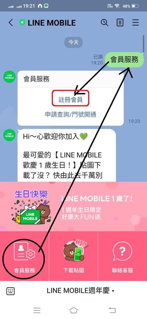 19.進入聊天畫面,按左下角的「會員服務」,再按對畫框裡的「註冊會員」。 https://i.imgur.com/We9ugV0.jpeg