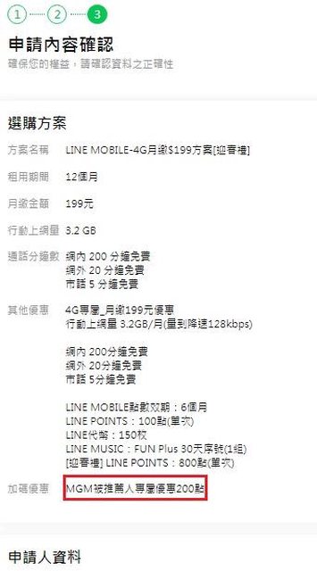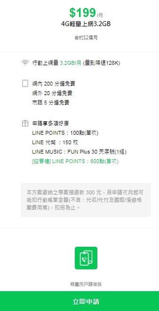 原Po把這標題「吃到飽232元、輕量40元」下得有含蓄, 因為原Po當時沒有把LM的推薦好友禮全算進去。 我想把這好康的方案寫清楚些, LM $199 輕量方案是每月倒貼60元, 對價條件價是請你幫忙拉人來LM(或是像網友直接把推薦碼丟到網路上分享)。 這種倒貼根本是來送門號+送流量、通話量+送錢的, 比2018年的亞太11元方案還優, 想要攢門號的別錯過了(LM 一季一門)。 這LM $199 輕量上網對微量用戶或一些老人而言, 比2018年的亞太11元方案還優, 亞太11元方案還要繳錢, LM $199 輕量方案是倒貼60元請你辦。 因為除了一開始伸手牌拿推薦碼,加贈 LP 200點之外, 辦好門號後,還可以生出1組推薦碼, 可再推薦5個其他人,再拿LP 1000點。 結果原本 4G $499 限速21M吃到飽 (499*12-3200)/12=232元/月 4G $199 輕量上網3.2GB (199*12-1900)/12=40/月 就變成 4G $499 限速21M吃到飽 (499*12-3200-200-1000)/12=132元/月 4G $199 輕量上網3.2GB (199*12-1900-200-1000)/12=-59.33/月 你沒看錯是負號59.33, ○B.加快辦門號速度的秘訣與提前驗證推薦碼是否可用。 為何要加快? 因為我是使用野生推薦碼(即直接放在網路上供使用),需要和網路路人甲乙丙比速度(1組推 薦碼供5個名額)。 如果一次要大量搶單,為避免搞混,建議可用PC一次多開2~3種流覽器(如Edge、Opera、Chr ome、FireFox)好分類 。 PS.為了要幫親戚多搶辦幾組,我4/11號開3個流覽器快搶門號後,到門市辦理時,門市還空 蕩蕩只有一個客人,等 我快辦完,門市來了快10組客人。 因為有別於以前的亞太或台灣之星模式--是要先拿到序號才有登錄到申請網頁; LM的申請網頁可以預先登錄,所以可以預先準備。 你可以選在5點50分左右,準備好已經打好的個人資料,複製貼上的先跑一次以下流程: 拿「 $199 輕量方案」舉例 https://www.linemobile-tw.com/bid?chtlinekey=199 1.進入網頁後,映入眼簾的畫面,按下方「立即申請」。 https://i.imgur.com/ZuXvQQ7.jpeg