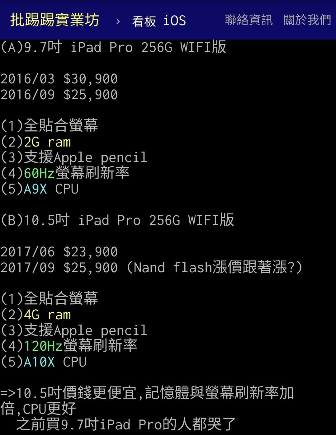 → gary8442 : 10.5吋 iPad Pro $20,900起 256G $23,900 05/19 17:04