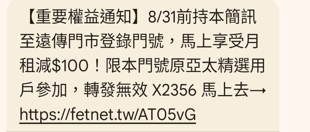 → jrtime : 這確實只是很平常的促銷方案簡訊啊 遠傳的規則從一 08/15 21:12