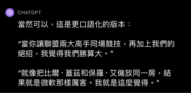 https://x.com/anthonyvslater/status/1718635569637371981 Draymond Green on his fit with Chris Paul "When you can put two of the smartest guys in the league on the floor with the weapons we have, I like the odds." “You put Bill Gates and Paul Allen in a room and you get Microsoft. That’s h ow I see it.” 嘴綠談與CP3的配合: 「當你讓聯盟中最聰明的兩人上場時,加上我們擁有的能力,我喜歡這個機會。」 「你把比爾蓋茲和保羅艾倫放在一個房間裡,你就得到了微軟。我就是這麼看的。」 是說我叫ChatGPT翻還蠻好笑的 https://i.imgur.com/I8bHZeN.jpg