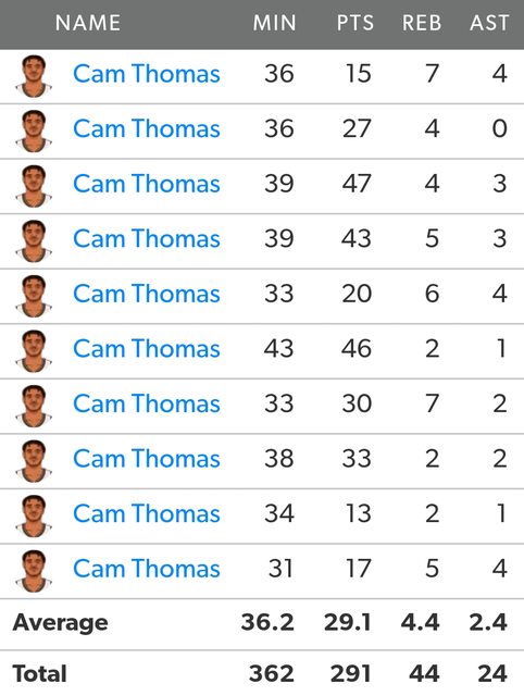 https://twitter.com/ESPNStatsInfo/status/1720631013737480276 Cam Thomas started his 10th career game on Friday, scoring 17 points. He has averaged 29.1 PPG through his first 10 starts, the most of any player to debut in the NBA since 1970-71, passing Michael Jordan (27.3 PPG). Cam Thomas今天迎來生涯第10場先發出賽,得到17分。 他生涯前10場先發出賽,場均得分29.1分,是自1970-71以來的最高紀錄,超越了MJ的27.3分。 Cam Thomas生涯前10場先發 http://i.imgur.com/PgVGXqL.jpg