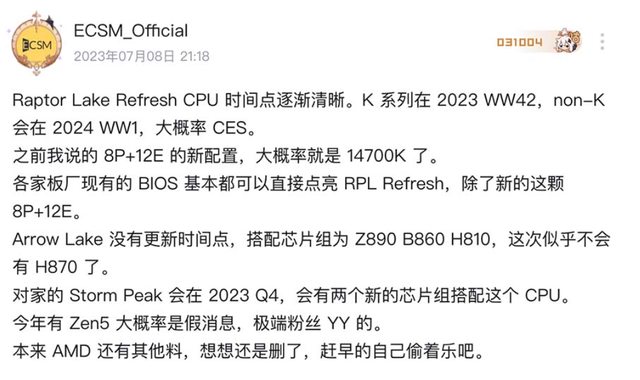 現在來自中國的消息則是提到 Raptor Lake-S Refresh