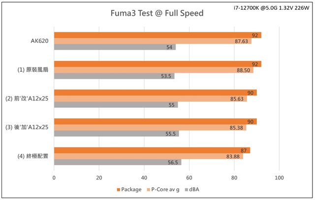 (2)跟(3)的情境,前風扇改成A12x25或是在後方加掛A12x25,各核心平均溫度能降低約3