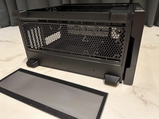整個機殼只有底部有配置PVC材質濾網,底部可安裝3個12cm風扇,且設有1個3.5/2.5裝置