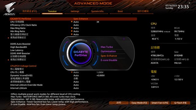 應該是因為B760無法超頻CPU的關係,並無看到PerfDrive主打的Instant 6GHz選項,這點