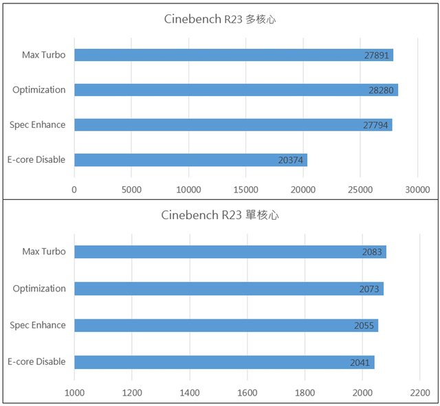 差異。以Cinebench R23測試跑分,除了關閉E-Core的選項多核心分數顯著下降外,其餘